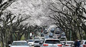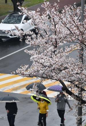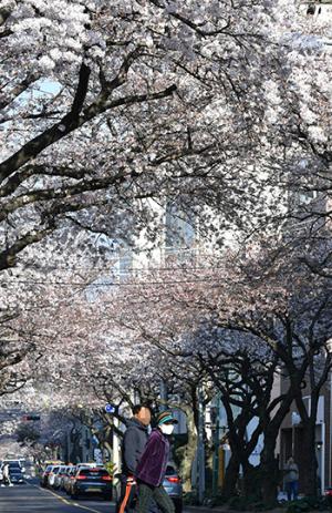 '3월의 끝자락' 봄의 전령사 벚꽃이 흐드러지게 핀 29일 제주대학교 입구 벚꽃 길에 많은 차량과 상춘객들로 인해 북새통을 이루고 있다. 김대생 기자