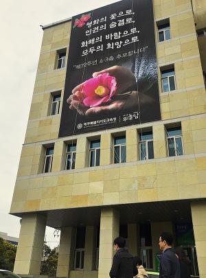 제72주년 4·3 희생자 추념식이 오는 4월 3일 제주4·3평화공원에서 진행되는 가운데 30일 제주도교육청 건물에 대형현수막이 내걸려 추모 분위기를 고조시키고 있다. 김대생 기자
