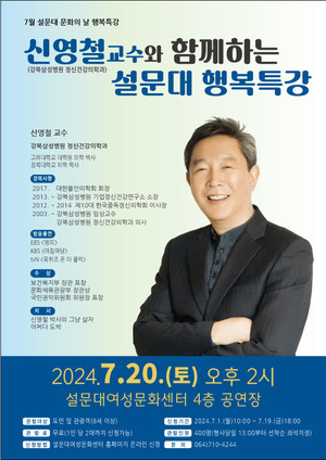 정신건강정책 혁신위원장인 신영철 강북삼성병원 정신건강의학과 교수가 다음달 제주서 도민과 만난다. 제주도 설문대여성문화센터는 다음달 20일 오후 2시 설문대여성문화센터 4층 공연장에서 '행복한 인생을 위한 정신과 의사의 조언' 을 주제로한 강연을 개최한다.강연에는 신영철 강북삼성병원 정신건강의학과 교수가 초청됐다.신영철 교수는 강북삼성병원 임상교수이자 정신건강의학과 의사로, 「그냥살자」 「어쩌다 도박」 등의 저서를 펴냈다. EBS '명의', KBS '아침마당', tvN '유퀴즈 온 더 블럭' 등 다수의 TV 프로그램에 출연한 바 있다