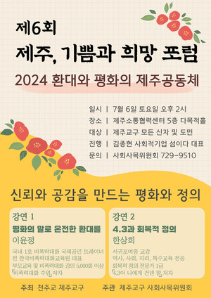 천주교 제주교구는 다음달 6일 제주소통협력센터 5층 다목적홀에서 '제6회 제주 기쁨과 희망 포럼'을 개최한다.포럼은 천주교 제주교구가 지난 2020년부터 지역의 인권과 평화, 생태, 환경 등을 주제로 매해 개최하고 있는 행사로 올해 여섯 번째를 맞이했다.'신뢰와 공감을 만드는 평화와 정의'를 주제로 열리는 이번 포럼에는 김종현 사회적기업 섬이다 대표가 사회를 맡아 진행할 예정이다.또 이윤정 전 한국비폭력대화교육원 대표가 '평화의 말로 온전한 환대를', 한상회 서귀포여자중학교 교감이 '4.3과 회복적 정의'라는 주제로 강연을 진행한다