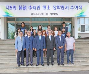 재일제주인 사업가인 이시향씨(80·제주대 명예경영학박사)의 애틋한 고향사랑이 화제다.제주대학교는 31일 이시향씨가 기탁한 장학금 3000만원을 제주대학교 인문대학 사학과 김예은 등 15명에 허향진 총장이 대신 각각 200만원의 장학금을 전달했다고 이날 밝혔다.장학금을 받은 학생중에는 이씨의 고향인 제주시 한경면 출신 2명과 모교인 제주중앙고(옛 제주상고) 출신 2명이 포함됐다.이씨는 2013년부터 5년째 장학금을 기탁하고 있다.이씨는 제주시 한경면 두모리 출신으로 고교를 졸업해 일본에 건너간 후 탁월한 경영수완을 발휘해 현재 ㈜월드