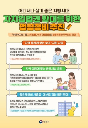 지방시대위원회와 법제처는 ‘어디서나 살기 좋은 지방시대’ 실현을 위해 자치입법권 확대 법령정비 사업을 추진했다.그 결과 아동복지법 등 22개 법률 개정안과 40대 대통령령의 일괄개정안이 18일 국무회의에서 의결됐다.법제처는 지난해 3월부터 지방시대위와 협업해 지방재정이 소요되는 자치사무와 관련된 법령을 전수 조사했다.이후 행정안전부와 대한민국시도지사협의회와 함께 17개 시도를 대상으로 의견을 수렴하고 법령 소관 부처와의 협의를 거쳐 조례 등으로 위임이 필요한 정비과제를 발굴해 총 62개 법령의 일괄개정을 추진했다.개정안의 주요 내용