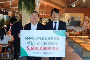 강동화 ㈜제스코마트 회장은 27일 초록우산 제주지역본부(본부장 변정근)에 아동 후원금 560만원을 전달했다.이번 후원금은 어린이 날을 맞이해 제주도내 보육원 아동들을 대상으로 용돈을 주기 위해 마련됐다.강동화 회장은 "도내 보육원 아동들에게 행복한 어린이 날을 선물할 수 있게 돼 기쁘다"며 "앞으로도 아동들을 위한 나눔활동을 전개하겠다"고 말했다. 한편 강동화 회장은 초록우산 그린노블클럽(1억 고액기부자모임) 1호에 가입돼 있는 등 나눔활동을 꾸준히 전개하고 있다.