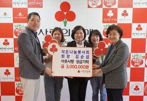 작은나눔봉사회(회장 김순섭)는 최근 제주사회복지공동모금회(회장 강지언)에 이웃사랑 성금 300만원을 기탁했다.이번 성금은 회원들과 가족 등이 함께 저금통과 빈병을 판매해 마련한 것으로, 지역내 취약계층 청소년들을 육성하는 데 사용된다.김순섭 회장은 "봉사회원들과 가족들이 함께 힘을 모아 마련해서 더욱 뜻깊다"며 "어려운 주변 이웃들에게 꾸준히 나눔을 실천할 수 있도록 노력하겠다"고 말했다.