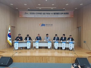 제주도는 26일 제주연구원 윗세오름에서 도교육청과 행정시, 도체육회·장애인체육회, 종목단체장, 도민 등 80여명이 참석한 가운데 '2026년 전국체전 성공 개최를 위한 발전방안 모색' 토론회를 개최했다.이번 토론회는 12년만에 제주에서 개최되는 전국체전을 2년여 앞두고 성공적 개최 방안을 모색하기 위해 마련됐다.토론회는 최영근 제주연구원 박사의 '2026년 전국체전 성공적 개최를 위한 발전방안' 주제발표로 시작됐다.이어 최영준 제주대학교 체육교육과 교수를 좌장으로 체육·문화예술·관광·디지털·경제·1차산업 전문가 6명이 패널로 참여해