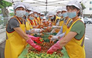 적십자사, 22일 나눔행사 '훈훈'취약계층 등 240여 가구에 전달이웃들의 건강한 여름나기를 기원하는 '오이소박이 나눔행사'가 열렸다.대한적십자사봉사회 제주시지구협의회(회장 김종빈)는 22일 제주적십자사 앞마당에서 봉사원 100여명이 참가한 가운데 희망풍차 결연가구를 위한 오이소박이 나눔행사를 진행했다.이날 봉사원들은 오이 2000여개로 만든 오이소박이를 제주시내 희망풍차 결연가구와 취약계층 240여 가구에 직접 전달했다.김종빈 대한적십자사봉사회 제주시지구협의회장은 "정성껏 만든 오이소박이를 맛있게 드