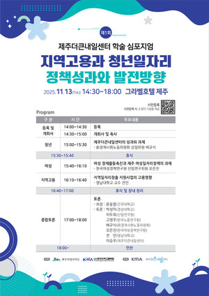 제주에서 지역고용과 청년 일자리 정책성과 사례를 공유하고 발전방향을 모색하는 자리가 마련된다.제주더큰내일센터는 13일 제주시 그라벨호텔에서 ‘제1회 제주더큰내일센터 학술 심포지엄’을 개최한다고 10일 밝혔다.이번 심포지엄은 제주도와 한국지역고용학회가 공동 주최하고 제주더큰내일센터가 주관하는 행사로, ‘지역고용과 청년 일자리 정책성과와 발전방향’을 주제로 열린다.전국의 지역고용정책 전문가와 실무자들이 모여 다양한 정책 사례를 공유하고 향후 발전 방향을 논의할 예정이다.행사는 청년이 지역사회의 주체로 성장할 수 있는 실질적 정책 방안을