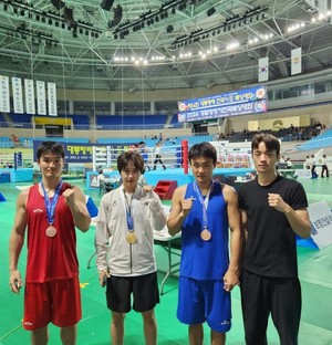 서귀포시체육회(회장 김태문)은 서귀포시청 직장운동경기부 복싱팀이 '제54회 대통령배 전국 시도복싱대회'에서 금메달 1개와 동메달 2개를 획득했다고 22일 밝혔다.서귀포시청 복싱팀은 지난 14일부터 22일까지 김천 실내체육관에서 개최한 대회에 곽민혁·정주형·전동훈·백진을 파견했다.정주형은 여자일반부 57㎏급에 출전해 결승전에서 김지연(대구광역시체육회)을 만나 3라운드 기권승으로 우승해 금메달을 목에 걸었다.전동훈은 남자일반부 67㎏급, 곽민혁은 남자일반부 75㎏급 준결승에서 각각 최민수(국군체육부대), 임현석(대전광역시체육회)에게 판