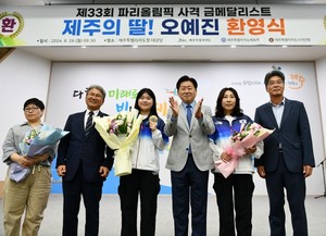 2024 파리올림픽 여자 공기권총 10m 금메달리스트 오예진(19·IBK기업은행) 선수가 고향 제주에서 도민사회로부터 따뜻한 환대를 받았다.전국 대회 규모 사격장이 없는 등 열악한 환경을 극복하고 세계적인 선수로 거듭난 오예진이 처음으로 출전한 올림픽 무대에서 수확한 값진 금메달로 도민사회도 한껏 고무된 분위기다.'사격 금메달리스트 오예진 공식 환영식'이 26일 오전 제주도청 탐라홀에서 오영훈 제주도지사와 이상봉 제주도의회의장, 체육계 관계자 등 150여명이 참석한 가운데 제주특별자치도체육회(회장 신진성) 주관으로 열렸다.제주도체육