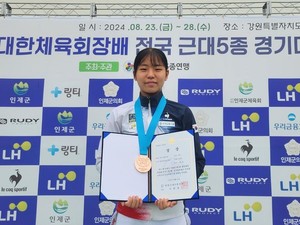 '제주 근대5종 기대주'로 불리는 이호연(제주사범대학부설고 1)이 제2회 대한체육회장배 전국 근대5종 경기대회에서 동메달을 획득했다.이호연은 지난 23일부터 28일까지 강원도 인제군에서 열린 이 대회 여고부 근대4종에 출전해 수영 253점(24위)과 펜싱 238점(7위), 레이저런 570점(2위)를 기록하며 총 1061점을 획득, 3위에 올랐다.같은 종목 1위는 1118점을 기록한 신수민(서울체고3)이 차지했으며, 이가영(대구체고3)이 1093점으로 2위를 거머쥐었다.단체전에 출전한 이호연·양나경·박은혜(이상 제주사대부고1)는 아쉽