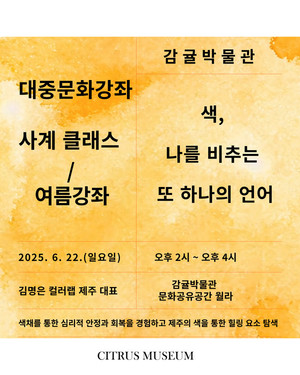 감귤박물관 개관 20주년을 기념해 대중문화 강좌 '사계클래스'의 두 번째 강좌인 '색, 나를 비추는 또 하나의 언어'가 이달 22일 감귤박물관 문화공유공간 '월라'에서 개최된다.이번 강좌는 제주의 색을 연구하는 컬러랩제주의 색채심리 전문가 김명은 대표의 진행으로 2시간 동안 제주의 색을 관찰하는 과정에서 자연과 연결된 색채 감수성을 키워낸다. 또 참여자가 각자 나만의 색을 만드는 과정을 통해 내면을 탐색하고 몰입을 경험하게 함으로써 마음회복과 힐링의 방법을 배우는 시간으로 구성된다.강좌 참가 신청은 오는 19일부터 20일 오후 3시