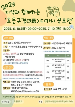 아름다운 사진으로 피사체가 주는 메시지와 함께 깊은 감동을 담아내는 디카시의 창작을 위한 강연이 지역주민들을 대상으로 운영돼 호응을 얻고 있다. 효돈중학교(교장 송미혜)는 지난 10일 하효경로당과 효돈동 주민자치센터에서 디카시 창작 강연을 운영했다.이와 함께 효돈동 지역의 아름다움과 일상을 시(詩)로 창작하는 '2025 효돈구경(9景) 디카시 공모전'이 함께 개최됐다.이번 강연은 디카시 시인 이은솔 강사를 초청해 어르신과 지역 주민을 대상으로 오전과 오후로 나눠 운영되고 있다.강연에서는 디카시의 개념과 창작 기법에 대해 이해를 돕는