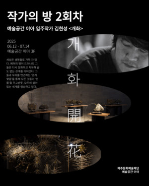예술공간 이아의 레지던시 입주작가 릴레이 전시 ‘작가의 방’이 두 번째 전시를 열었다. 이번 전시에서는 김현성 작가의 설치작품 ‘개화’를 선보인다.제주문화예술재단은 예술공간 이아에서 12일부터 다음달 14일까지 김현성 작가의 설치작 ‘개화’를 중심으로 ‘작가의 방’ 2회차 전시를 개최한다고 16일 밝혔다.‘작가의 방’은 예술공간 이아 레지던시 프로그램에 참여 중인 입주작가들이 자신의 창작 환경과 예술세계를 직접 전시 공간에 구현하는 릴레이 쇼케이스 프로그램이다. 이번 전시는 지난 달 진행된 1회차 류동혁 작가의 사진 전시에 이은 두