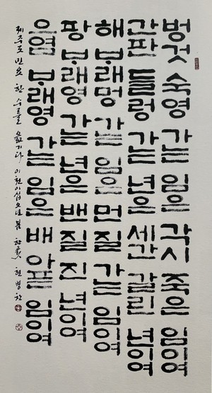 정다운 제주말씨를 전통 한글서예로 담아낸다.㈔제주도한글서예사랑모임(이사장 현병찬)은 오는 30일까지 저지문화예술인마을 먹글이있는집에서 제31회 회원전 ‘아름다운 제주어 살아있네’를 개최한다.전시에서는 회원들의 미학적 예술을 갈고 닦은 서예 작품 다수를 선보인다.이번 전시는 서예를 새로운 문자표현의 융합 예술로 발전시키고, 향후 서체 디자인의 발전 방향을 모색하기 위해 마련됐다.또한 전시를 통해 제주어의 보전 가치를 재조명하고 작가들의 작품을 가장 제주적인 관광 상품으로 발전시킨다는 계획이다.더불어 제2회 ‘제라진 제주어 오고생이 쓰