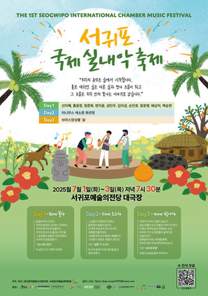 제1회 서귀포 국제 실내악 축제가 오는 7월 1일부터 3일까지 오후 7시30분 서귀포예술의전당 대극장에서 개최된다.한국관악협회 서귀포지부가 주최하는 이번 축제는 관악기 숨결과 실내악 깊이를 주제로 Blow(불다), Flow(흐르다), Glow(빛나다) 등 매일 각기 다른 세 가지 테마로 무대를 선보인다.무대는 지역 연주자와 초연으로 꾸려지며, 전석 무료 공연이다.첫날은 모차르트, 하이든 등 고전 작곡가들의 관악 협주곡으로 구성된 독주 무대가 이어진다.선지혜·홍윤정·정준화·변지윤·성민우·김지성·정호영·손인호·배상익·백승연·송희라가 무