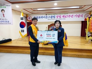 모슬포라이온스클럽(회장 이승돌)이 대정읍사무소를 방문해 창립 47주년을 기념해 대정지역 어려운 이웃을 위한 성금 400만원을 4월 5일 제주사회복지공동모금회에 지정 기탁했다.이승돌 회장은 “회원들의 정성으로 모여진 성금이 어려운 이웃을 위해 뜻깊게 쓰여지길 원해 지정기탁을 하게 됐다"며 "생계가 어려운 이웃 등 긴급 구호의 손길이 필요한 이웃을 위해 사용되어지길 바란다”고 전했다.기탁된 성금은 제주사회복지공동모금회에 기탁돼 대정지역에 어려운 이웃 또는 사회복지시설 대상으로 사용될 예정이다.