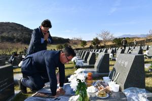 유족회·경우회 화합 토대 여순사건 등 전국 연대유해발굴·유적지 정비·희생자 추가 신고 등 과제 △진상규명 공감대 확산제주4·3은 2013년 8월 2일 제주4·3희생자유족회와 제주도재향경우회간 화해·상생 선언으로 새로운 전기를 맞게 됐다. 수십 년간 이어진 이념논쟁을 끝내고 화합의 시대를 열어가자는 것으로 국민통합과 4·3 전국화의 토대가 됐다. 4·3 71주년인 지난해 4월 3일 군·경이 서울 광화문 광장에서 열린 4·3 추념행사에 처음 참석, 희생자 영전에 애도를 표했다. 당시 민갑룡 경찰청장은 방명록을
