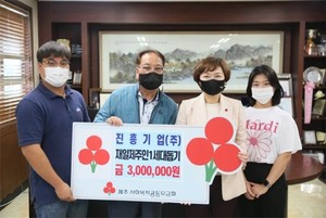진흥기업㈜(회장 이철수)은 지난 5일 본사에서 제주사회복지공동모금회(회장 강지언)에 재일제주인 1세대 지원을 위한 성금 300만원을 기탁했다.이철수 회장은 "과거 재일제주인 어르신의 물심양면 지원이 있었기에 지금의 제주를 만들 수 있었다"며 "성금이 재일제주인 어르신들에게 조금이나마 보탬이 됐으면 좋겠다"고 말했다.한편 이철수 회장은 제주사회복지공동모금회의 1억 원 이상 고액 기부 모임인 '제주 아너 소사이어티' 28호 회원이다. 홍진혁 기자