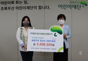 초록우산 어린이재단 제주지역본부(본부장 박정숙)는 지난 13일 본부 사무실에서 경제적 어려움으로 치료 중단 위기에 처한 도내 가정에 의료비 300만원을 전달했다.이날 전달된 의료비는 ㈔도농상생국민운동본부(대표 정영일)가 서울 영동농협(조합장 이종호)의 사회공헌 공익기금을 후원받아 기탁받아 마련됐다.박정숙 본부장은 "도움이 절실히 필요한 위기 가정에 따뜻한 손길을 건넬 수 있게 도움을 준 기관에 너무 감사하다"며 "앞으로도 다양한 사회공헌 단체와의 협업을 통해 여러 어려움을 겪고 있는 가정에 희망을 전달할 수 있도록 노력하겠다"고 말
