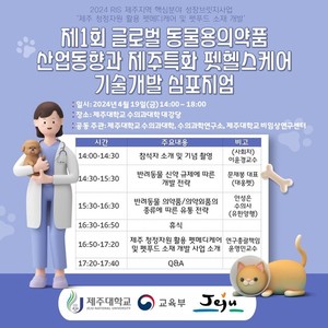 제주대학교(총장 김일환)는 오는 19일 제주대 수의과대학 대강당에서 '제주 청정자원 활용 펫메디케어 및 펫푸드 소재개발' 심포지엄을 개최한다.이 심포지엄은 '글로벌 동물용 의약품 산업 동향과 제주특화 펫헬스케어 기술 개발'을 주제로 열린다. 제주지역혁신플랫폼(RIS) 핵심분야 성장브릿지 사업 일환이다.문재봉 대웅펫(동물용의약품 기업) 대표는 동물용 의약품 개발 전략에 대해 발표한다. 안성은 수의사는 검역본부 허가와 동물약품협회 신고품목 등에 따른 유통의 차이점을 소개한다.제주대는 "이번 심포지엄을 통해 국내 펫푸드 시장의 현황과 발