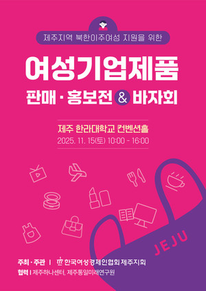 한국여성경제인협회 제주지회는 오는 15일 오전 10시부터 오후 4시까지 한라대학교 컨벤션센터에서 '여성기업제품 홍보·판매전 및 나눔바자회'를 개최한다고 11일 밝혔다.이번 행사는 제주지역 여성기업과 여성창업가의 경쟁력을 알리고, 판매 수익금 일부를 북한이탈여성들의 정착과 창업 지원에 후원하기 위한 취지로 마련됐다. 이를 통해 여성경제인들의 비전과 경험을 공유하고, 상호 협력 네트워크를 확대하는 종합 교류의 장이 될 전망이다.행사에는 한국여성경제인협회 제주지회 회원사와 여성 창업가, 유관기관 관계자, 도민 등이 참여한다. 또 여성기업