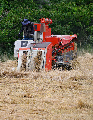 초록색의 청보리밭이 황금색으로 익어가는 가운데 22일 제주시 애월읍 고성리 농촌에서는 보리 수확작업이 한창이다. 김용현 기자