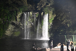 계속된 비날씨가 그치고 한여름밤의 무더위가 찾아와 도민과 관광객 등이 웅장한 자태를 뽐내고 있는 천지연 폭포를 바라보며 더위를 식히고 있다.