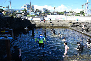 장마가 그친 제주는 30일 낮 최고 기온이 34도를 기록하는 등 불볕더위가 절정을 이루는 가운데 서귀포시 법환동 막숙 포구 용천수 물에서 아이들이 물놀이를 즐기고 있다.
