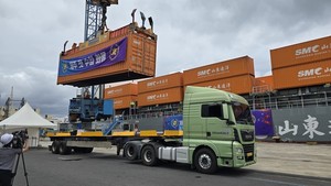 중국 칭다오에서 출발한 컨테이너 화물선 ‘SMC르자오’로가 18일 제주항에 입항했다.제주특별자치도는 이날 제주항 국제여객터미널에서 ‘제주-칭다오 정기 컨테이너선 첫 입항식’을 가졌다.이번 제주-중국 항로 개설은 1968년 제주항이 무역항으로 지정된 이후 57년 만에 개설된 첫 정기 국제항로 개설로 SMC르자오호는 매주 월요일 칭다오항에서 출항해 수요일 제주항에 도착한 후 금요일 다시 칭다오로 출항하는 일정으로 정기 운항을 하게 된다.지난 16일 중국 칭다오에서 출발한 SMC르자오호는 제주삼다수 페트병 원료인 페트칩과 가구, 기계장비