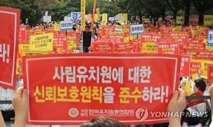 (서울=연합뉴스) 공병설 기자 = 정부는 사립유치원 단체인 한국유치원총연합회 소속 사립유치원이 오는 18일과 25∼29일로 예고한 집단휴업을 강행할 경우 원아모집 정지와 정원 감축 등을 통해 강력히 대응하기로 했다.정부는 14일 정부서울청사에서 박춘란 교육부 차관 주재로 관계부처 대책회의를 열어 이번 집단휴업이 불법이라는 입장을 재확인하고,관련 법령에 따라 엄정 대처하겠다고 밝혔다.유아교육법 시행령은 유치원 휴업일은 매 학년도 시작 전에 보호자 요구 및 지역 실정을 고려해 정하되, 관공서 공휴일 및 여름·겨울 휴가를 포함해야