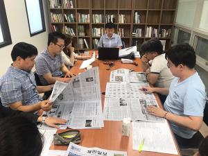 제민일보 편집심의위원회(위원장 김석주 편집국장)는 29일 본사 편집국 회의실에서 8월 2차 회의를 열고 지면 개선 방안 등을 논의했다.김석주 편집국장은 "요즘은 신문을 1면부터 정독하는 독자가 많지 않다. 독자는 신문을 넘기며 눈에 들어오는 기사를 읽는다"며 "단시간 독자의 시선을 사로잡을 수 있도록 신문을 편집해야 한다"며고 강조했다.김대생 교육문화체육부 부국장은 "제목 부터 사진 편집, 배치까지 독자가 읽기 편한 신문을 만들어야 한다"고 말했다.
