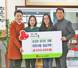 제주동여자중학교 3학년에 재학중인 김고은·김다은 쌍둥이 자매(16)는 9년째 어려운 이웃을 위한 나눔을 이어오고 있다.이들 자매의 '세뱃돈·용돈 나눔'은 아이들이 나눔을 실천하는 어른으로 자라나길 바라는 아버지 김순일씨(47)의 바람으로 시작됐다.지난 2008년 2월 8살 나이에 아버지와 함께 처음 제주사회복지공동모금회를 찾아 설에 받은 세뱃돈과 부모에게 받은 용돈으로 마련한 40만원을 기부한 것을 시작으로 매년 세뱃돈과 용돈을 차곡차곡 모아 소외된 이웃에 전달하는 등 나눔의 소중한 가치를 키우고 있다.고은·다은 쌍둥