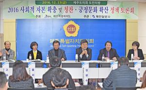 고승한 연구위원 "사회적 시스템 구축·정책 발굴 필요"김순관 교육국장 "학교현장 폭력·학업중단 급감 효과"홍리리 전 대표 "공감되는 사례 중심의 인성교육 도움"강경희 국장 "지역사회 참여·프로그램 확대 등에 주력"제민일보(대표이사 백승훈)가 23일 제주도의회 도민의방에서 개최한 '2016 사회적 자본 확충 및 칭찬·긍정문화 확산' 정책 토론회에 참석한 고유봉 제주특별자치도 사회협약위원회 위원장은 '칭찬과 긍정의 힘' 주제 기조강연을 통해 사회적 자본 확충을 위한 칭찬과 긍정의 중요성을 강조