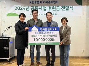초록우산 제주후원회(회장 황금신)와 포항후원회(회장 정창섭)는 최근 포항시 남구에 위치한 식당에서 아동가정 주거환경 개선사업비 전달식을 개최했다.이번 사업비는 양 기관이 제주·포항지역내 아동들의 행복하고 건강한 성장을 돕기 위해 마련했다.황금신 제주후원회장은 "다양한 복지사업과 교류를 할 수 있도록 노력해 준 포항후원회에 감사하다"고 전하는 한편 "올해도 우리 아동들의 미래를 위한 사업이 잘 진행될 수 있도록 최선을 다하겠다"고 밝혔다.