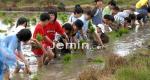 ▲ 동광초등학교 6학년 어린이 380명이 1일 오전 한경면 용수리의 한 논에서 농사체험학습으로 모내기를 하고 있다.