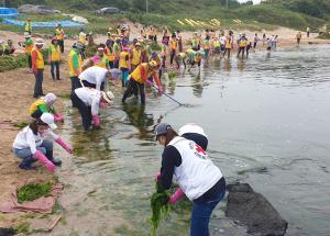 대한적십자사 제주특별자치도지사 (회장 오홍식)는 지난 22일 대한적십자봉사회 제주특별자치도협의회 (회장 박순덕) 주관으로 서귀포시 성산읍 신양리 해수욕장 일대에서 강석보 성산일출봉농협조합장, 정영헌 성산읍장을 비롯한 적십자봉사원, 청소년적십자(RCY)단원, 도내 기관 및 단체 임·직원, 마을주민 등 모두 600여명이 참가한 가운데 "후손에게 물려줄 곱닥한 제주 바당 만들기" 바다정화 활동을 전개했다.봉사활동을 전개한 신양리 해수욕장 일대는 많은 양의 파래가 밀려와 갯바위 및 백사장등에 쌓여 미관을 해치고 있다. 또한 파래가 썩으