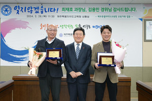 제주도교육청은 최근 최재호 제주동부경찰서 형사과장과 김용민 제주경찰청 여성청소년과 수사관(경위)에게 감사장을 수여했다.도교육청에 따르면 두 경찰관은 학생을 보호하고 교직원의 교육활동을 위해 악성 민원을 근절한 공로를 인정받았다. 수년간 많은 교원과 공무원 등에 고질적인 악성 민원을 제기한 민원인을 수사하고 검거해 교원이 안전하게 수업에 전념할 수 있는 환경을 조성하는 것에 기여했다.또한 범죄에 연루된 10대 청소년 선도를 위해 교육청·경찰·사회복지기관·아동보호전문기관 등 관계기관과 JSS실무협의회를 개최, 다양한 지원 방안을 협의했