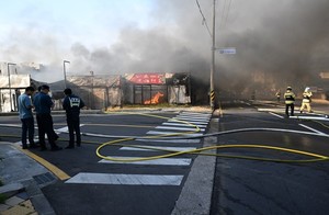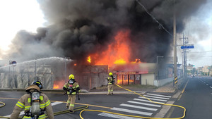 서귀포시의 한 대형 의류 매장에서 화재가 발생했다.12일 오전 6시 11분께 서귀포시 남주고 사거리에 위치한 가건물 의류 매장에서 불이나 검은 연기가 도로가를 뒤덮었다.인화성이 강한 비닐과 패널 등으로 지어진 가건물 특성상 쉽게 불길이 잡히지 않고 있다가 오전 8시 5분께 초진이 완료됐다.서귀포시내 먼거리에서도 시커먼 연기가 목격되자 시민들이 119에 수십건의 화재 신고가 빗발쳤다.오전 8시 5분 현재 인명피해는 없는 것으로 최종 확인됐으며 화재로 인해 현재 남주고 방향 4차선 도로가 전면 통제 중이다. 소방당국은 정확한 화재 원인