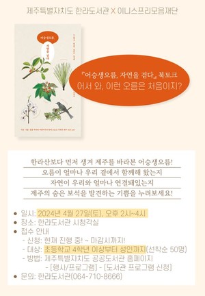 제주 오름의 인문·생태학적 가치를 공유하는 북토크가 열린다. 한라도서관은 오는 27일 오후 2시 시청각실에서 1년 동안 어승생오름의 다양한 모습을 기록한 책 '어승생오름, 자연을 걷다' 저자 초청 북토크 '어서 와, 이런 오름은 처음이지?'를 진행한다.책 '어승생오름, 자연을 걷다'는 지질학자와 식물학자, 동물학자, 여행작가 등 저자가 1년 동안 어승생오름을 함께 오르며 자연의 다양한 모습을 함께 기록한 책이다.해발 1169m, 한라산에 가까운 제주시 해안동 어승생오름은 수려한 경관으로 많은 사람이 방문하는 대표 오름으로 꼽힌다.