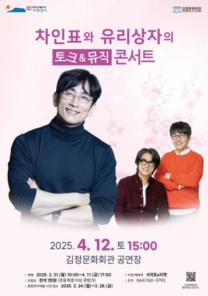 서귀포시 김정문화회관은 봄의 따뜻한 감성을 전하기 위해 오는 4월 12일 오후 기획공연 '차인표와 유리상자의 토크&뮤직 콘서트'를 개최한다.이번 공연은 배우 차인표의 깊이 있는 인생 이야기와 듀오 가수 유리상자의 감미로운 선율이 어우러진 무대로 관객들에게 특별한 감동을 선사할 예정이다.공연은 두 개의 무대로 구성돼 1부에서는 '아름다운 세상', '사랑해도 될까요' 등 명곡으로 많은 사랑을 받아온 유리상자의 감동의 하모니를 선보이며 2부에서는 배우 차인표가 강연자로 나서 드라마의 성공을 통해 얻게 된 인기 배우로서의 경험과 작가로서의