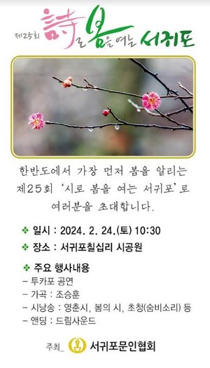 (사)한국문인협회 서귀포지부(지부장 정영자)는 오는 24일 서귀포칠십리시공원에서 제25회 '시로 봄을 여는 서귀포' 행사를 개최한다.식전행사로 투카포 공연과 조승훈씨의 가곡 독창, 문협 회원들의 영춘시와 봄의 시 낭송이 이어진다.이어 서귀포 숨비소리 시낭송회 회원 2명이 찬조 출연해 시 낭송을 이어갈 예정이며, 드림사운드의 공연으로 끝을 맺는다. 정영자 회장은 "한반도에서 가장 먼저 봄이 왔음을 알리는 행사가 올해로 제25회를 맞이하고 있다"며 "예향 서귀포의 우수성을 널리 알려 나감으로써 문화도시로서의 품격을 높여나가겠다"고 밝혔