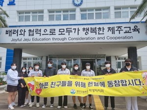 대한적십자사제주특별자치도지사(회장 오홍식)는 지난 6일부터 7일까지 제주제일고등학교RCY(명예단장 문홍철) 단원, 지도교사 등 20명이 참여한 가운데 제주제일고에서 '오늘은 우리 헌혈하는 날!' 캠페인을 전개했다.이날 제주제일고RCY 단원들은 등굣길 학생을 대상으로 헌혈 참여에 동참해줄 것을 독려했다.제주제일고RCY 관계자는 "헌혈은 잠깐의 따끔함으로 꺼져가는 생명을 살리는 고귀한 일"이라며 "앞으로도 기회가 된다면 꾸준히 헌혈을 참여하겠다"고 말했다.한편 1984년 결단된 제주제일고RCY는 분기별 생명 나눔을 실천, 현재까지 1만