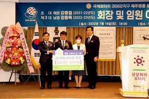 국제로타리3662지구 제주영웅로타리클럽(회장 강종욱)은 지난 16일 메종 글래드 제주에서 제2대 회장 이·취임식을 기념해 초록우산 어린이재단 제주지역본부(본부장 박정숙)에 취약아동 주거환경 개선사업(영웅 사랑의 집)을 위한 성금 2000만원을 후원했다.이번 성금은 황금신 회성종합건설㈜ 대표 1000만원, 고영준 제주서부로타리클럽 전임 회장 200만원, 강종욱 제주영웅로타리클럽 회장 500만원, 제주영웅로타리클럽 300만원의 기부금으로 마련됐다.강종욱 신임회장은 "2대 회장으로서 막중한 책임감을 느낀다"며 "제주영웅로타리클럽이 클럽이
