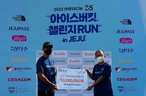 제주특별자치도개발공사(사장 김정학)는 지난 27일 서귀포시 성산읍 플레이스 캠프 제주에서 열린 '2022 미라클365 아이스버킷 챌린지 런인제주' 행사에 동참, 1000만원을 기부했다.이번 행사는 비영리재단법인 승일희망재단(공동대표 박승일, 션)이 국내 최초 루게릭요양센터 건립비를 모금하기 위해 마련했다.해당 행사는 각자 정한 코스를 달린 후 얼음물을 뒤집어쓰는 챌린지에 참여해 루게릭 환우와 가족을 응원하는 기부캠페인이다.김정학 개발공사 사장은 "매일 힘든 삶을 이어가고 있는 루게릭병 환우의 어려움을 조금이나마 공유하고자 한다"고
