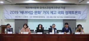 유네스코 '보편적 가치' 강조, 억척스러운 여성 대상화 경계박상미 의장 "공동체 접근 다양할수록 활용·보전 가능성 커"실생활 직결·수평적 합의 등 해녀회 성격 공감대 유도 필요'제주해녀'가 지닌 가치를 어디에서 어떻게 찾아야 할 것인가. 과연 우리는 제대로 찾으려 하고 있는가. 지난 4일 국회의원회관에서 열린 제주해녀문화 유네스코 인류무형문화유산 대표목록 등재 3주년 기념 국회 정책토론회가 예정 시간을 넘기며 뜨겁게 이어졌던 배경에 던져진 질문이다. 문화다양성의 상징이라고 하면서도 정작 대상화하는데