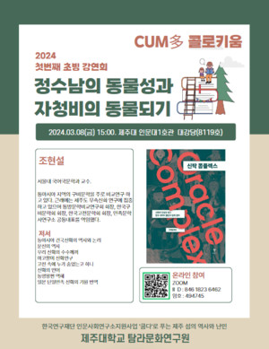 제주대학교 탐라문화연구원(원장 김치완)은 오는 8일 오후 3시 제주대 인문대학 1호관 대강당에서 조현설 서울대학교 국어국문학과 교수를 초청, '제1회 쿰다콜로키움'을 개최한다.연구원에 따르면 강연자로 나서는 조현설 교수는 동아시아 구비문학과 신화 연구의 세계적인 권위자로, 최근 제주 무속신화를 연구하고 있다.이번 콜로키움의 강연 주제는 '정수남의 동물성과 자청비의 동물되기'로, 새로운 관점에서 제주 무속신화를 살펴볼 예정이다.강연은 줌(ZOOM)을 통해 생중계 된다.김치완 원장은 "제주학에 관심있는 사람들에게 많은 영감과 지식을 전