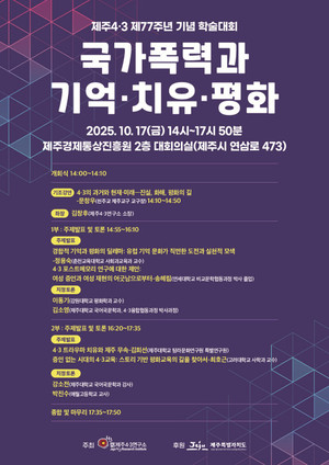 제주4·3연구소는 오는 17일 제주경제통상진흥원에서 제주4·3 제77주년 기념 학술대회를 개최한다고 13일 밝혔다.이번 학술대회는 '국가폭력과 기억·치유·평화'를 주제로 17일 오후 2시 개회식을 진행한다.김창후 제주4·3연구소 소장을 좌장으로 문창우 천주교 제주교구 교구장이 기조강연 '4·3의 과거와 현재·미래-진실, 화해, 평화의 길'을 진행한다.1부에서는 정용숙 춘천교육대학교 사회교육과 교수가 '경합적 기억과 평화의 딜레마', 송혜림 연세대학교 비교문학협동과정 박사가 '4·3 포스트메모리 연구에 대한 제언'을 발표하고 이동기