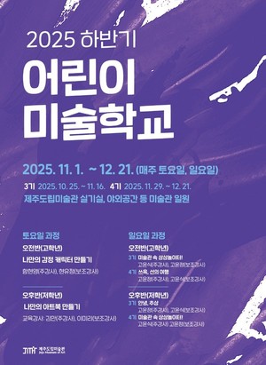 제주도립미술관이 주말마다 어린이들이 미술을 배울 기회를 마련한다.제주도립미술관은 오는 25일부터 12월 21일까지 '2025 어린이 미술학교' 하반기 교육프로그램을 운영한다고 13일 밝혔다.이번 프로그램에는 함현영, 김만, 고윤식, 고윤정 작가가 참여해 주말마다 총 5개 과정으로 진행될 예정이다.우선 함현영 작가의 '나만의 감정캐릭터 만들기'에서는 자신의 경험 속 감정을 클레이로 조형해 캐릭터로 만든다.김만 작가의 '나만의 아트북 만들기'에서는 전시를 감상한 느낌과 생각을 글과 그림으로 표현하고 다양한 북 아트 기법을 적용한다.고윤