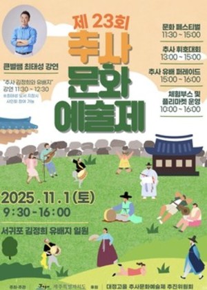 조선 후기 예술의 거장 추사 김정희 선생의 예술정신을 기리는 '제23회 추사문화예술제'가 서귀포에서 열린다.제주특별자치도 세계유산본부는 다음 달 1일 서귀포시 김정희 유배지 일원에서 '세한도, 제주에서 피어난 추사의 예술혼'을 주제로 추사문화예술제를 개최한다고 밝혔다.이번 행사는 문화·공연·체험·경연 등 4개 부문, 14개 프로그램으로 구성됐으며 전 프로그램이 무료로 진행된다.문화 부문에서는 추사 숭모제와 개막식, 그리고 최태성 강사의 특별강연 '추사 김정희와 서귀포 김정희유배지'가 마련됐다. 공연 부문은 길트기 풍물행렬, 전통공연