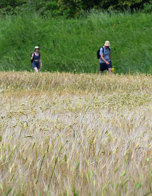 17일 애월읍 올레16코스 인근에 연녹색 청보리가 절정을 이룬 가운데 한 올레꾼이 청보리밭 길을 거닐며 제주여행을 즐기고 있다. 김용현 기자
